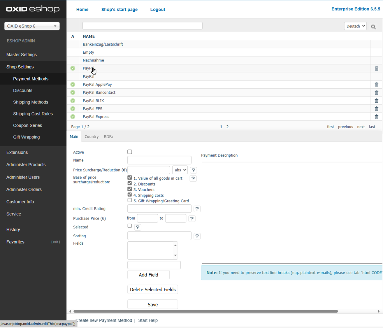 Under , the payment methods PayPal as well as other important payment methods are marked as active.
