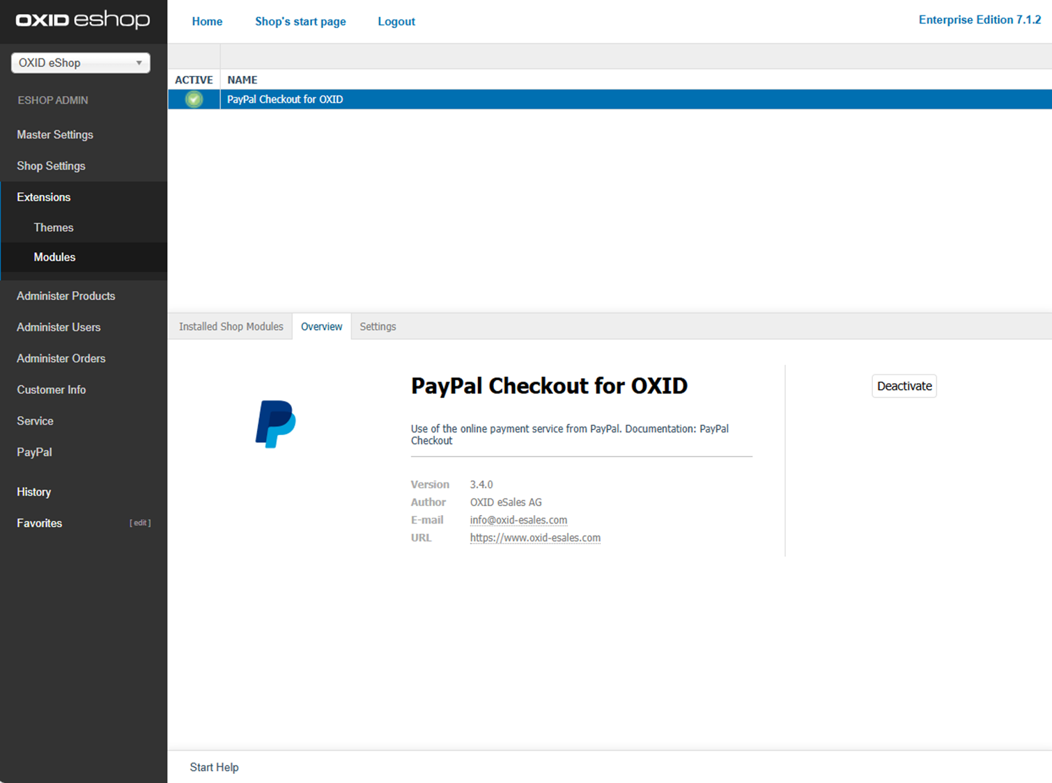 When the installation process is finished, the module PayPal Checkout for OXID appears in the administration area under (Figure: PayPal Checkout for OXID installed and activated).