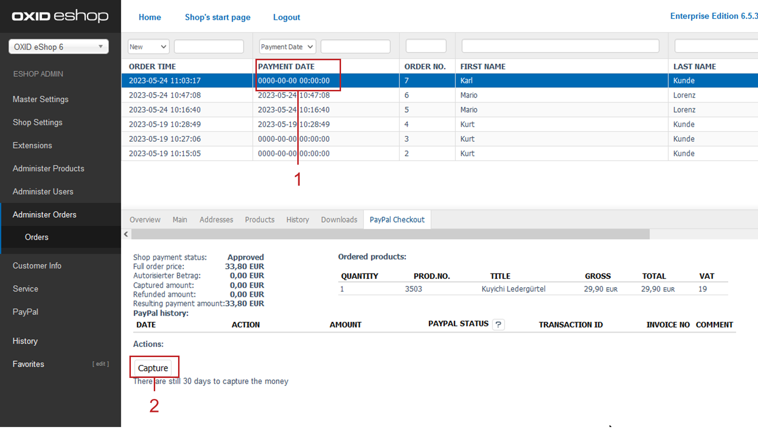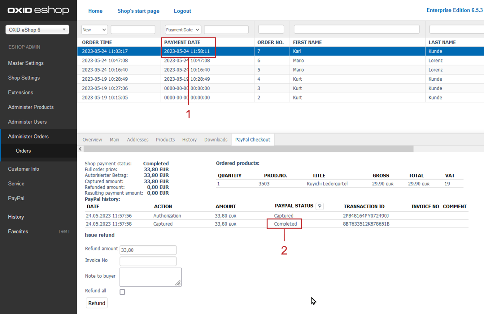With the next page refresh, the order is marked as paid in the list of orders (Figure: Reserved payment: Checking the PayPal status, item 1).