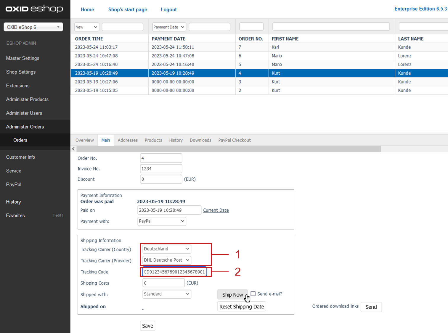 On the Main tab, enter the tracking code in the corresponding input field (Figure: Sending tracking code and shipping provider data to PayPal, item 2) as usual.