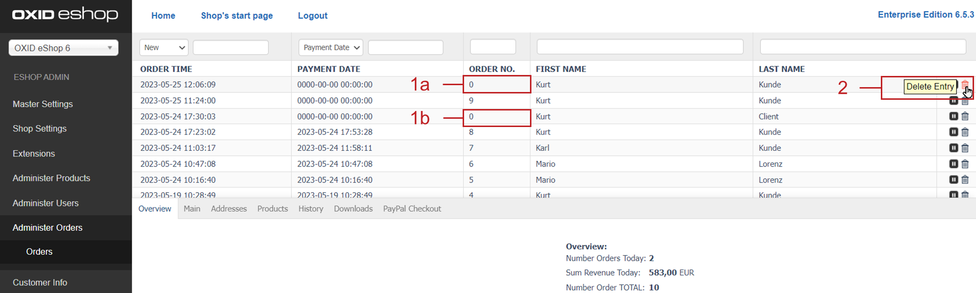 Unfinished orders have order number 0 (Figure: Deleting incomplete orders manually, item 1a, 1b).