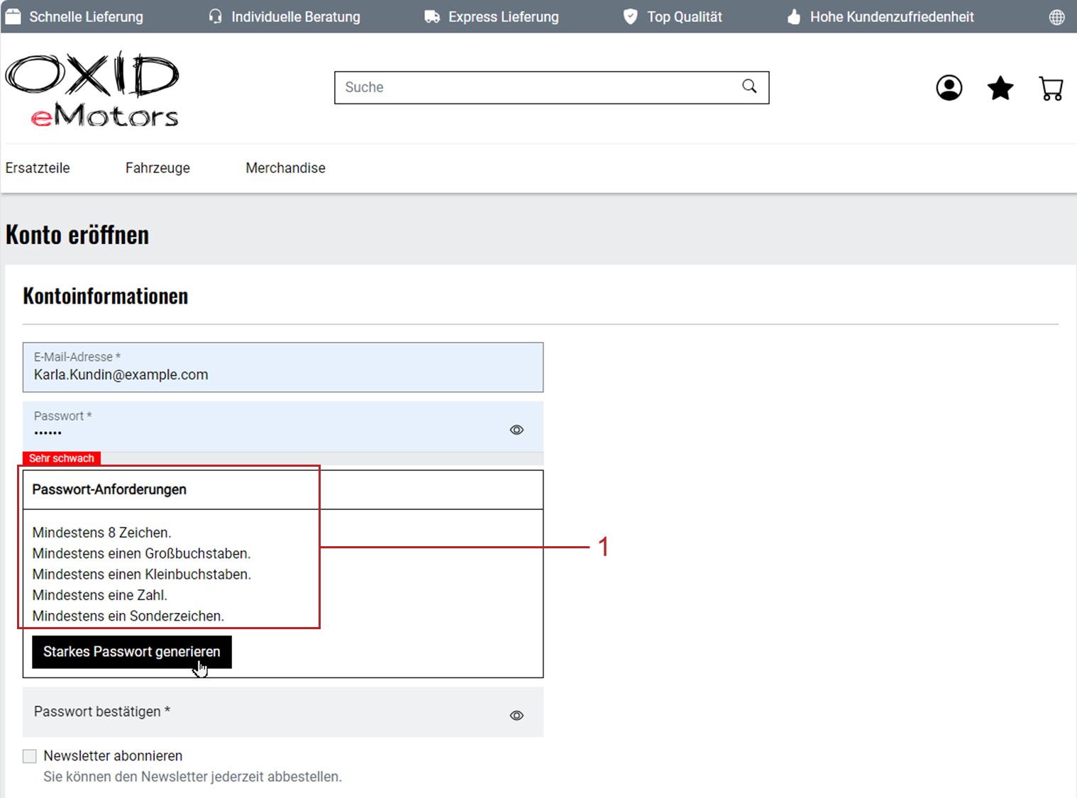 Ihren Kunden werden die Anforderungen angezeigt, wenn Sie in das Eingabefeld fürs Passwort klicken (Abb.: Anforderungen für Passwörter, Pos. 1).