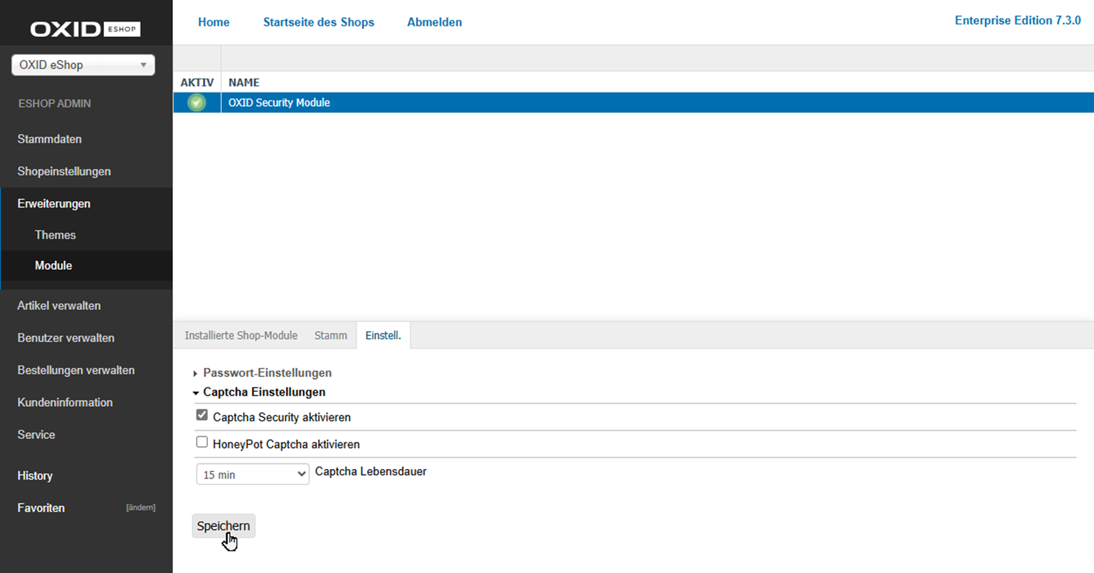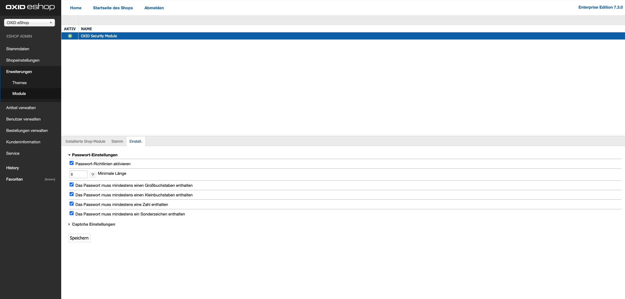 Das OXID Security-Modul ist direkt nach der Aktivierung betriebsbereit (Abb.: OXID Security-Modul installiert und aktiviert).