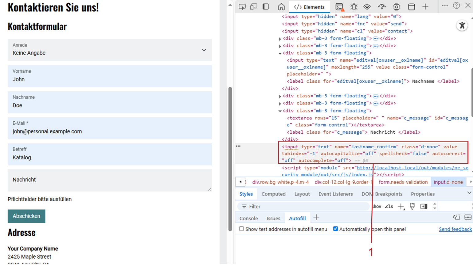 lastname_confirm(Abb.: Honeypot-CAPTCHA untersuchen, Pos. 1):<input type="text" name="lastname_confirm" class="d-none" value="" tabindex="-1" autocapitalize="off" spellcheck="false" autocorrect="off" autocomplete="off" />