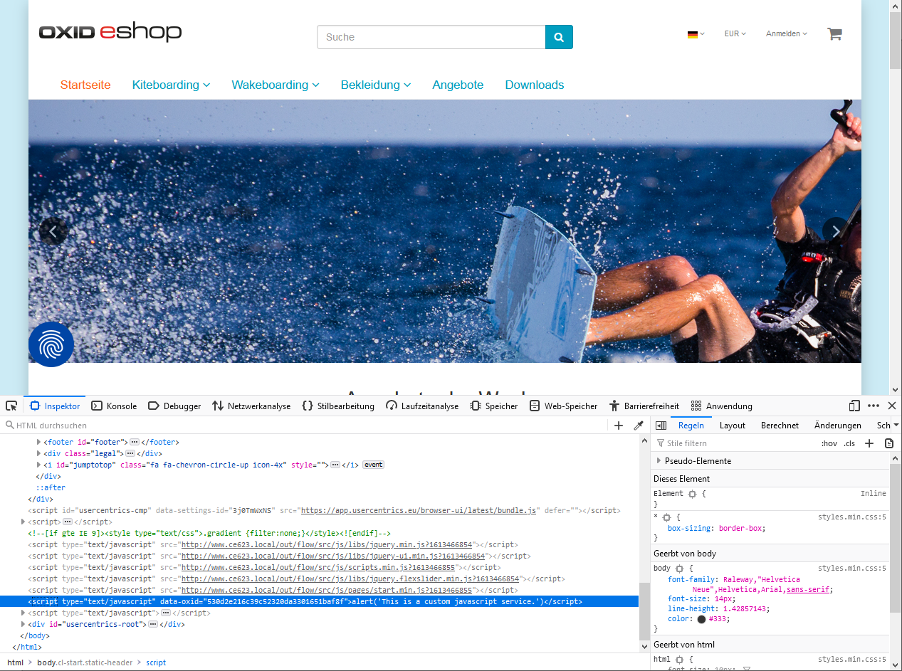 Um den Hash für ein Snippet zu erhalten, fügen Sie das Snippet einer Seite des Shops hinzu und rufen Sie diese im Browser auf. Über die Tools für Web-Entwickler können Sie jetzt auf den Wert des data-oxid-Attributs zugreifen.
