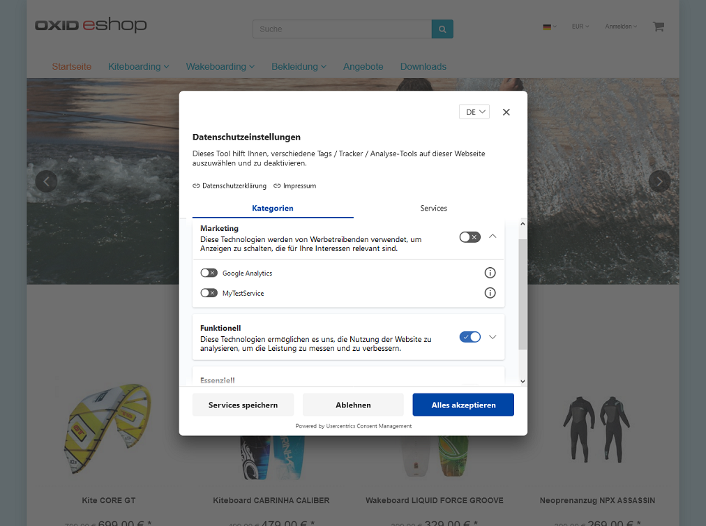 Wenn Sie in Ihrem OXID eShop einen Dienst verwenden, der nicht in dieser Datenbank vorhanden ist, konfigurieren Sie den Dienst in Ihrem OXID eShop und legen ihn im Usercentrics Admin Interface als benutzerdefinierten Dienst an.