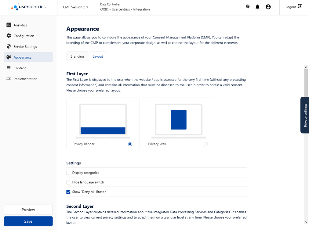 Wie die Datenschutzeinstellungen im OXID eShop angezeigt werden, legen Sie unter Appearance fest.