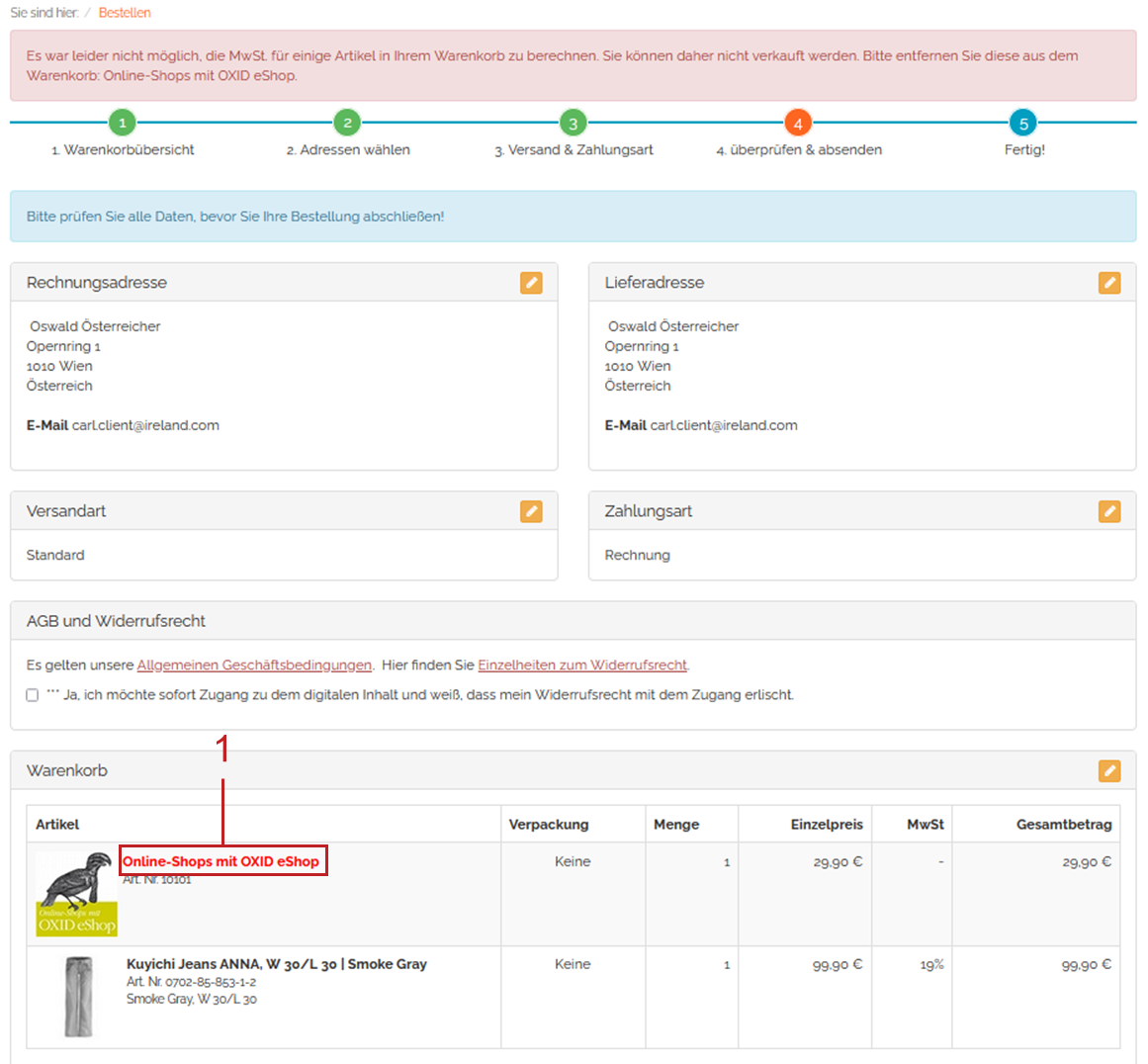 If the VAT rates are missing for the country from which the customer wants to order, an error message is displayed with a reference to the item in question (see What happens in case of error).