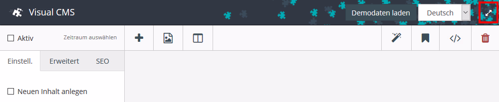 Diese Schaltfläche ermöglicht es Visual CMS von der Oberfläche des OXID eShop Administrationsbereichs zu lösen und in einem eigenen Fenster im Browser anzeigen zu lassen. Dadurch wird eine größere Übersicht sowie mehr Platz beim Arbeiten mit CMS-Inhalten erreicht.
