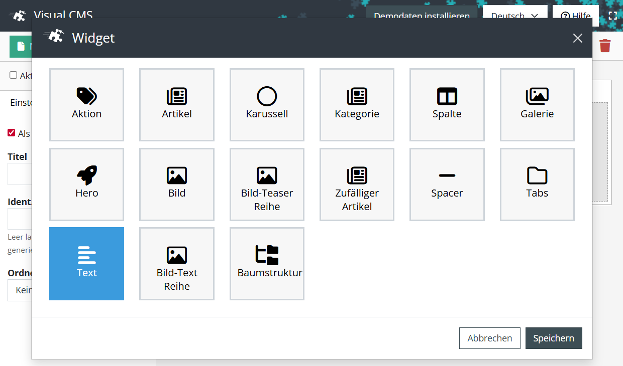 Der einfachste und schnellste Weg, um eine CMS-Seite mit Inhalt zu füllen, ist über das Hinzufügen eines Text-Widgets: