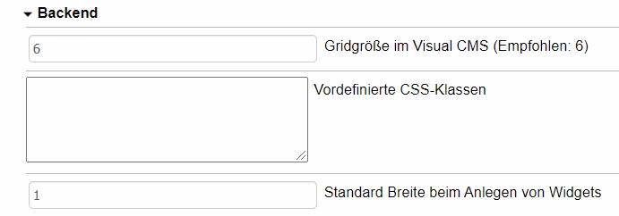 Die Backend-Einstellungen ermöglichen es über die Gridgröße die minimale Breite von Widgets und Offsets in der Visual CMS Oberfläche zu definieren, sowie die Standardbreite von neuen Widgets. Zudem können eigene CSS-Klassen vorgegeben werden.