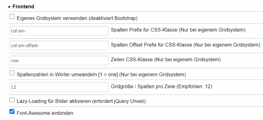 Zusätzlich kann hier die Einbindung der Font-Awesome Bibliothek deaktiviert werden. Dies erlaubt das Einbinden eines anderen Fonts für Icons oder Font-Awesome in einer erweiterten Version.