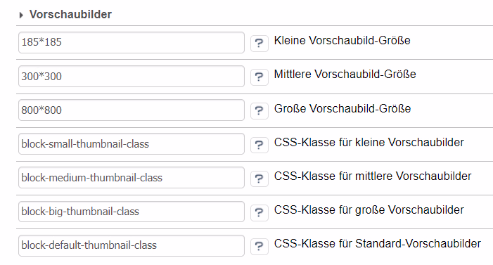 Diese Einstellungen ermöglichen es, die maximale Breite und Höhe der Vorschaubilder festzulegen, die im Bild-Widget und im Galerie-Widget im Frontend verwendet werden, wenn in den Widget-Einstellungen ausgewählt wurde. Zudem können die CSS-Klassennamen für Vorschaubilder angepasst werden.