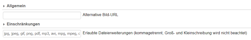 Die erlaubten Dateiformate müssen hier eingetragen werden, um den Upload in der Mediathek zu ermöglichen. Die einzelnen Dateiendungen werden durch Kommas getrennt.