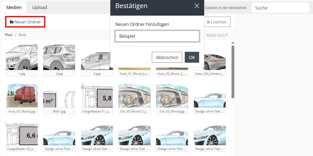 Um Ihre Medien zu verwalten, können Sie eine Ordnerstruktur etablieren. Klicken Sie hierzu einfach auf den Button Neuer Ordner und vergeben Sie einen Namen für diesen.