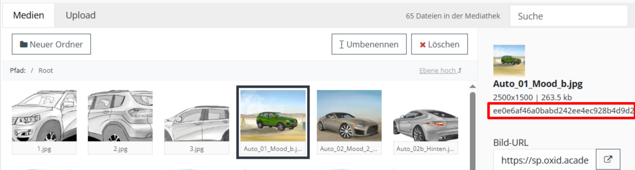 Wird eine Mediendatei über die Mediathek hochgeladen, legt der Shop diese im passenden Verzeichnis ab und generiert automatisch eine ID für diese Datei. Die ID sorgt dafür, dass auch bei Änderungen des Namen oder Pfads die Datei weiterhin eindeutig identifiziert werden kann.