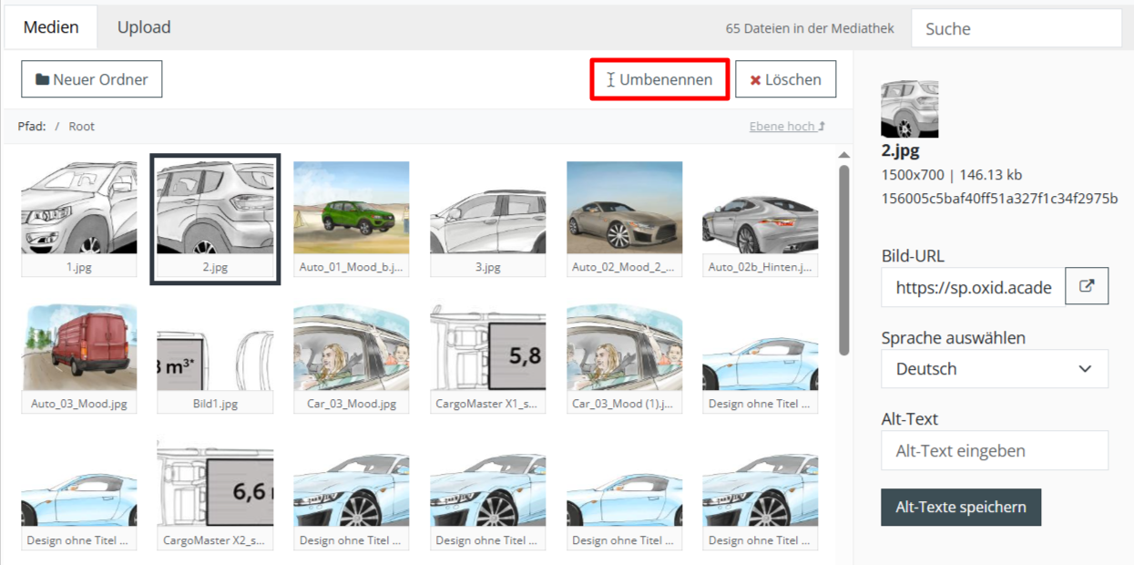 Um den Dateinamen zu ändern, wählen Sie eine Mediendatei aus und klicken oben auf Umbenennen.