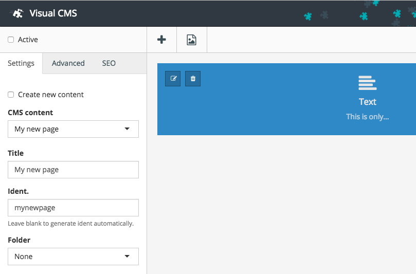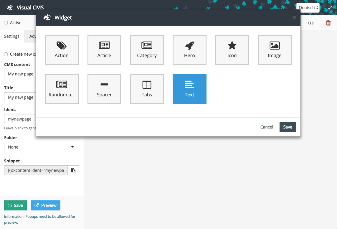 CMS-pages can be changed by adding or editing widgets. The Visual CMS automatically generates a text widget with the page content for CMS pages, which are edited for the first time using the editor. The Visual CMS allows you to edit CMS pages in a fast and comfortable manner. Pages not edited via the Visual CMS still function as before.